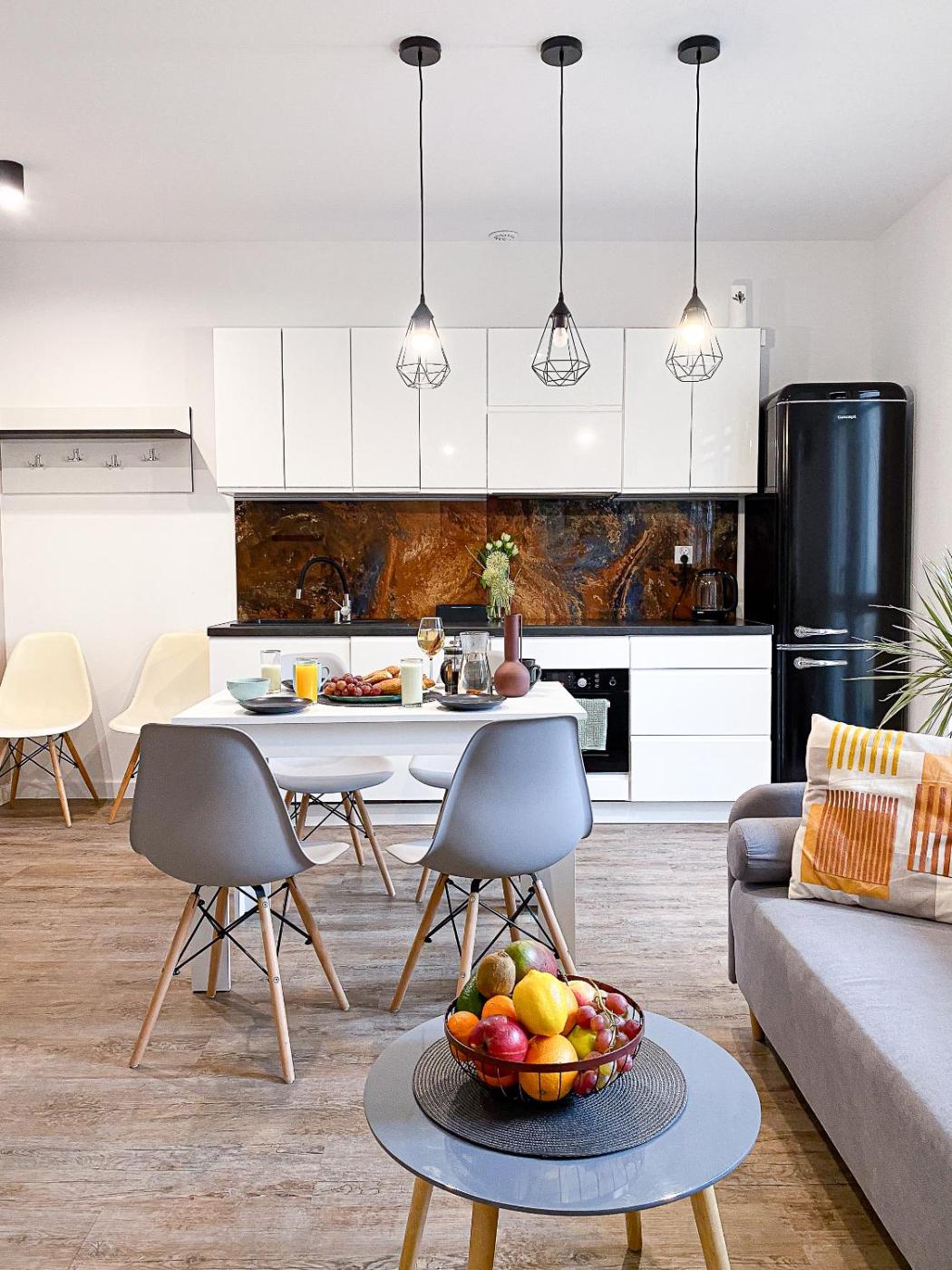 Oferta apartamentu obejmuje sypialnię (1), salon, aneks kuchenny z pełnym wyposażeniem, w tym lodówką i czajnikiem, a także łazienkę (1) z prysznicem oraz suszarką do włosów. W apartamencie zapewniono ręczniki i pościel.