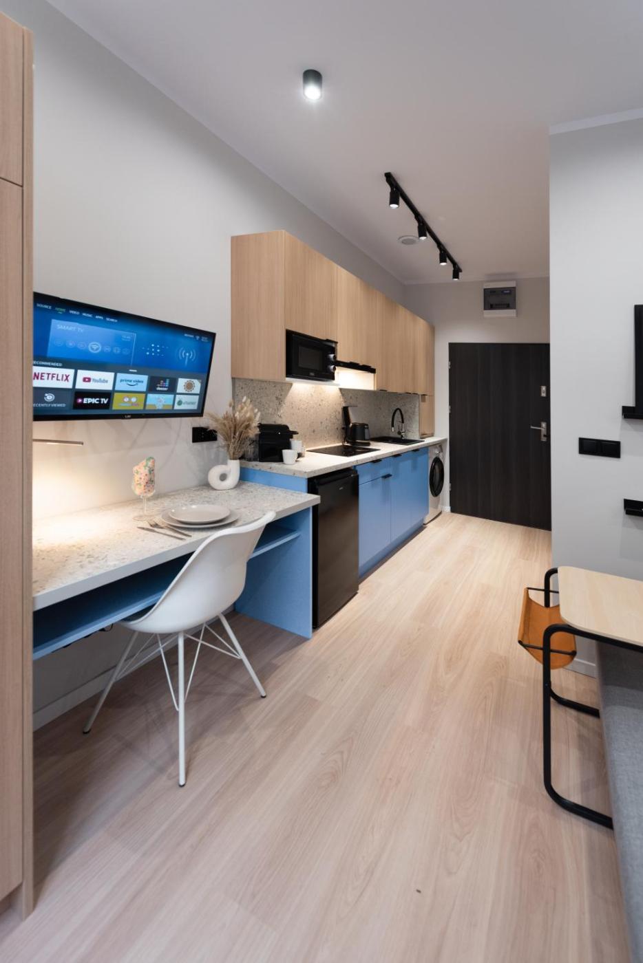 Apartament z 1 sypialnią. This apartment comprises a kitchen, a seating area, 1 separate bedroom and 1 bathroom with a shower and a hairdryer. Meals can be prepared in the well-fitted kitchen, which comes with a stovetop, a refrigerator, kitchenware and a microwave. The apartment provides a washing machine, a tea and coffee maker, a dining area, a flat-screen TV, as well as city views. The unit offers 1 bed. Apartament - 1 osobowy. Powierzchnia pokoju ok.: 14 mkw.