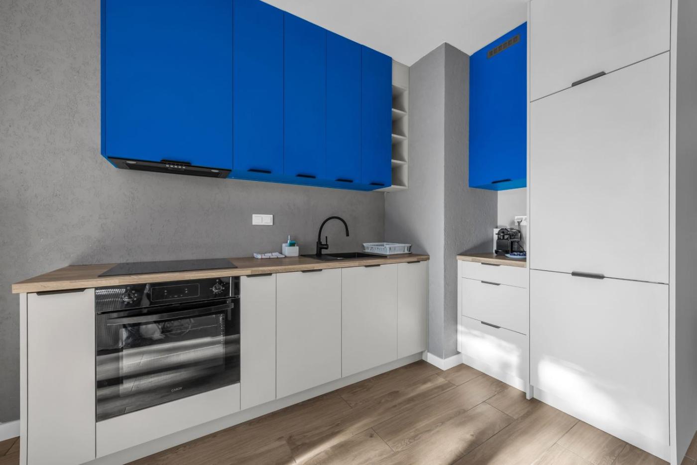 W apartamencie znajduje się telewizor z płaskim ekranem. Wyposażenie aneksu kuchennego obejmuje lodówkę, zmywarkę, piekarnik, a także ekspres do kawy i czajnik.
